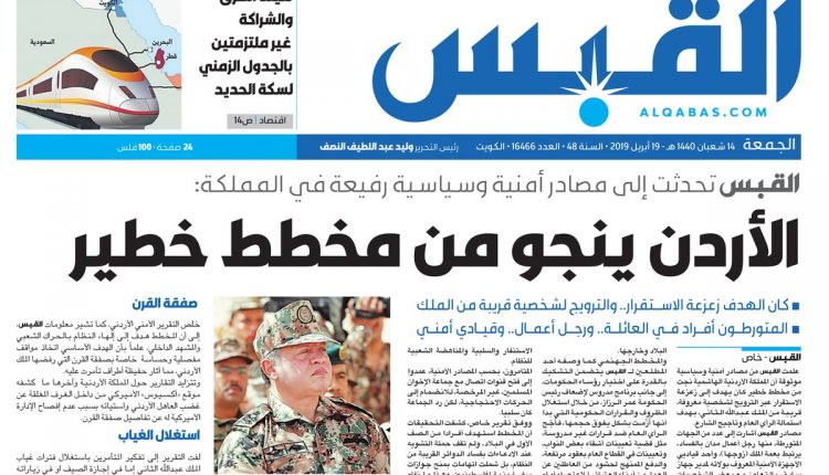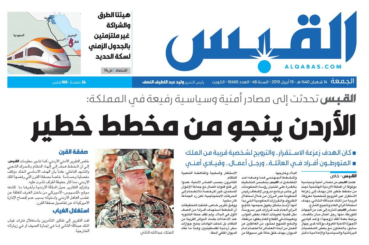 مصادر رفيعة ل«القبس»: #الأردن ينجو من مخطط خطير — أطراف تآمرت على #الملك_الأردني بسبب مواقفه الرافضة ل #صفقة_القرن — المخطط كان هدفه زعزعة الاستقرار.. والترويج لشخصية قريبة من الملك — المتورطون أفراد في العائلة.. ورجل أعمال وقيادي أمني