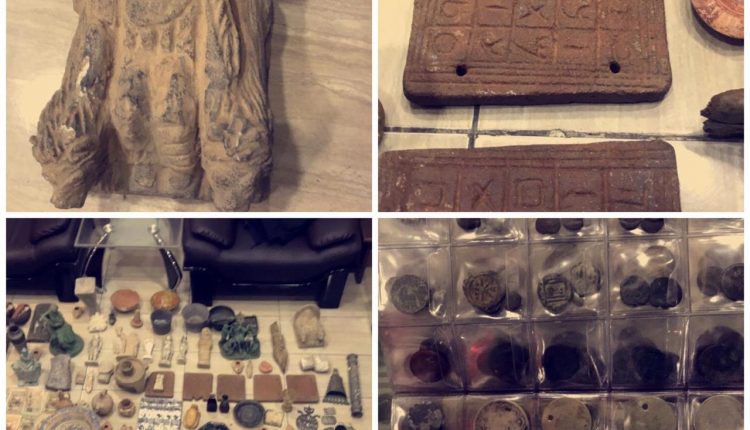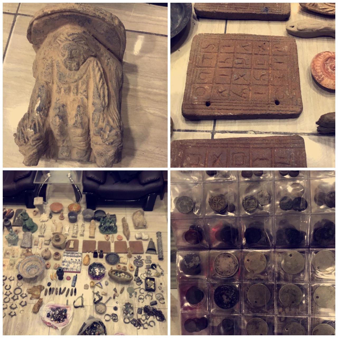 وأضاف الناطق الإعلامي بأنه جرى تحديد مكان تواجد ذلك الشخص وأُلقي القبض عليه وبحوزته مجموعة من القطع الفخارية والأحجار البازلتية ذات النقوش التاريخية وقطع نقدية ذات قيمة تاريخية وجميعها يعود للعصور القديمة وبعضها يصل أعمارها إلى ألفي عام بالإضافة لمجموعة من التماثيل المقلدة والتي لا تحمل أي قيمة أثرية ، والتحقيقات مستمرة.