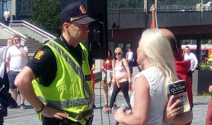 وهج 24 : قامت رئيسة مجموعة “أوقفوا أسلمة النرويج” اليمينية، أنّا براتن، برمي نسخة من القرآن الكريم أرضا، وإهانة المسلمين، خلال مظاهرة معادية للإسلام، في مدينة درامن النرويجية.
