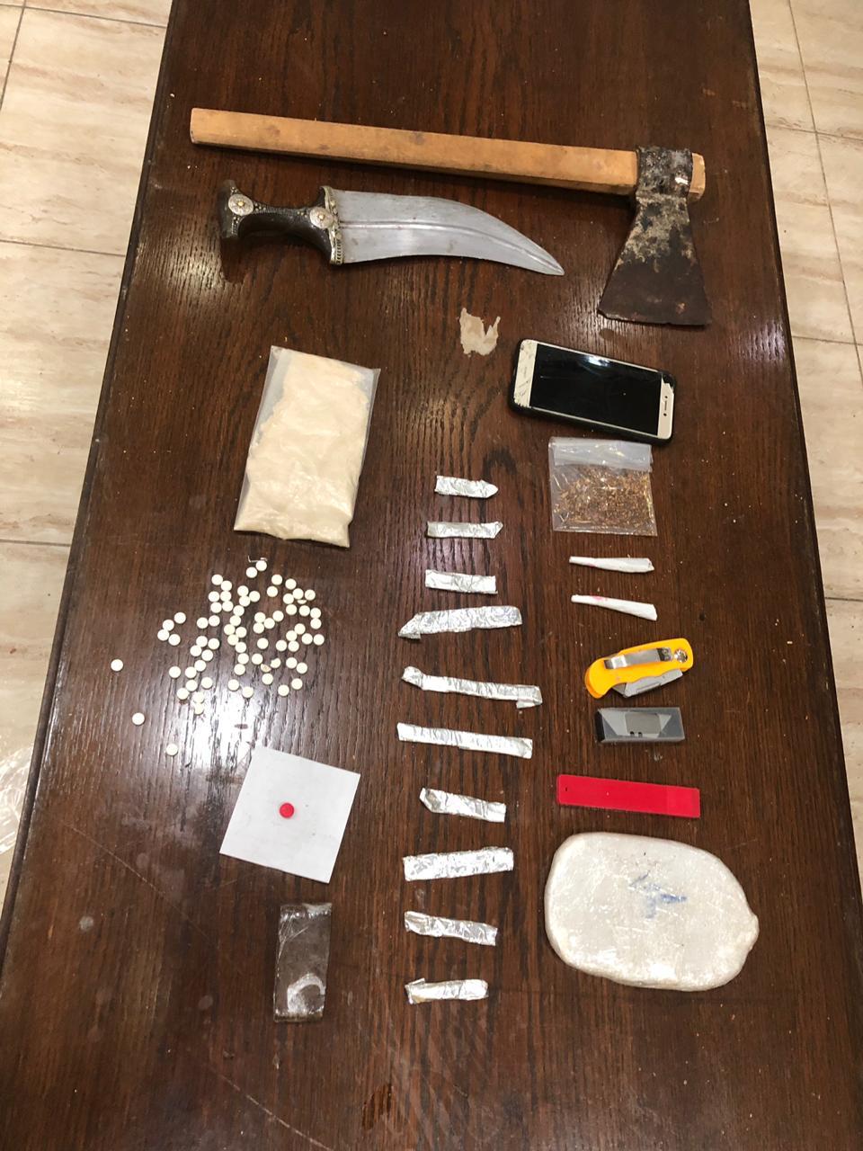 وبتفتيش المنزل عثر بداخله على كف ونصف من مادة الحشيش المخدرة اضافة الى مجموعة من القطع المجهزة للبيع من ذات المادة وكيس بداخله كمية من بودرة الحشيش الصناعي و٢٠٠ حبة مخدرة وجرى ضبط الادوات الحادة التي كانت بحوزتهم وبوشرت التحقيقات.