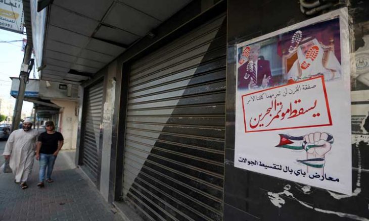 وكُتب على لافتات على مداخل المؤسسات والمحال التجارية “ليسقط مؤتمر البحرين” و”لا لصفقة القرن” إضافة إلى “مؤامرة صفقة القرن لن تمر”. كما جرى وضع لافتات مماثلة بحجم أكبر على مداخل المدن والمخيمات في قطاع غزة.