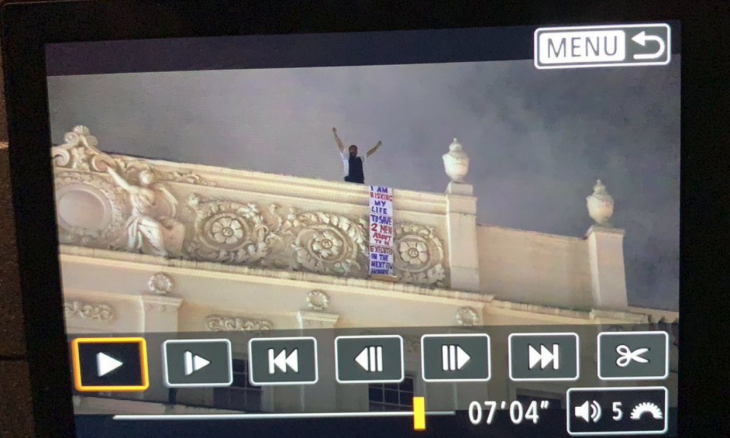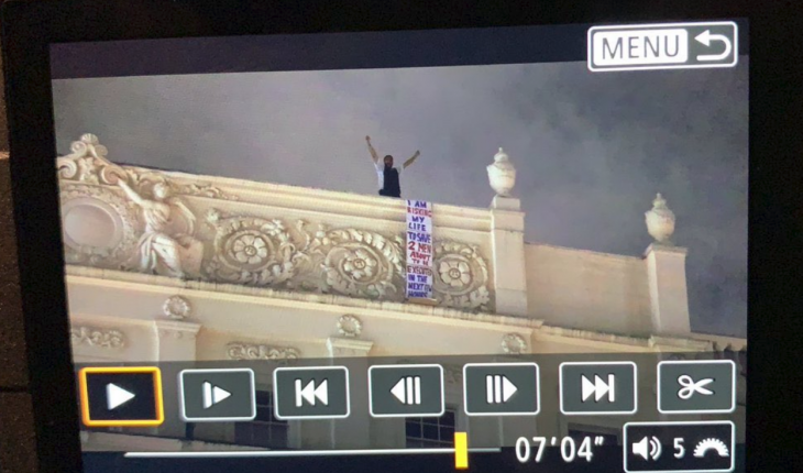 وأظهر الشريط المصور الشرطة وهي تطلب من طاقم السفارة “الابتعاد” عن المتظاهر حين كان على السطح.