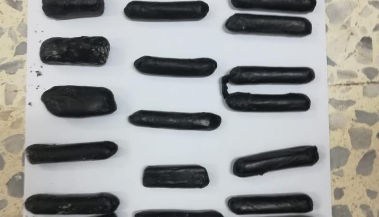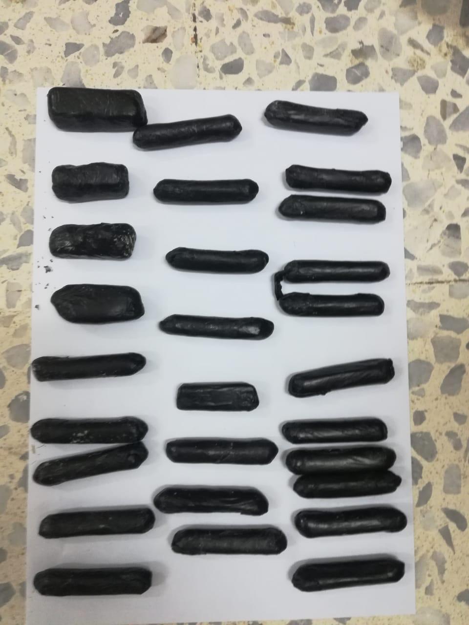 واضاف الناطق الاعلامي انه تم اخراج ٢٨ بالوناً من جسده بداخلها ٣٤١ حبة مخدرة وقطع من مادة الحشيش المخدرة وكمية من بودرة الحشيش الصناعي .