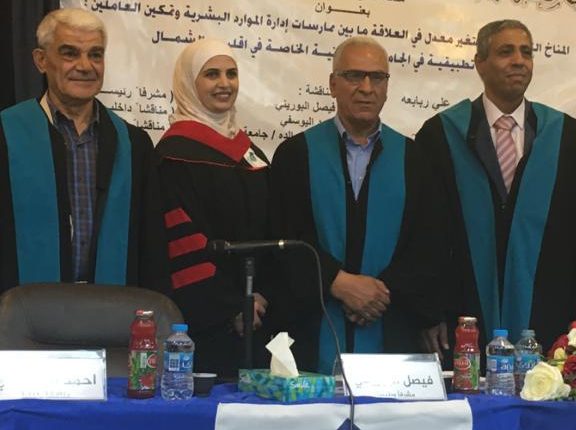 تكونت لجنة المناقشة من الدكتور فيصل البوريني مشرفاً ورئيساً والدكتور خلدون خوالدة مناقشاً خارجياً والأستاذ الدكتور أحمد اليوسفي مناقشاً داخليا، وفي نهاية المناقشة أعلنت اللجنة منح الطالبة درجة الماجستير .