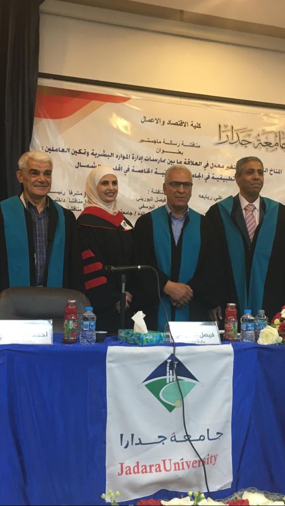 وهج 24 : نوقشت أطروحة ماجستير في كلية الاقتصاد والأعمال في جامعة جدارا للطالبة مرام تركي ربابعة بعنوان” المناخ التنظيمي كمتغير معدل في العلاقة ما بين ممارسات إدارة الموارد البشرية وتمكين العاملين : دراسة تطبيقية في الجامعات الأردنية الخاصة في إقليم الشمال” هدفت الدراسة إلى التعرف على أثر المناخ التنظيمي في العلاقة ما بين ممارسات إدارة الموارد البشرية وتمكين العاملين في الجامعات الأردنية الخاصة في إقليم الشمال، والتعرف على المناخ التنظيمي السائد في الجامعات الأردنية الخاصة في إقليم الشمال ، وعلى مستوى تمكين العاملين في الجامعات الأردنية الخاصة في إقليم الشمال.