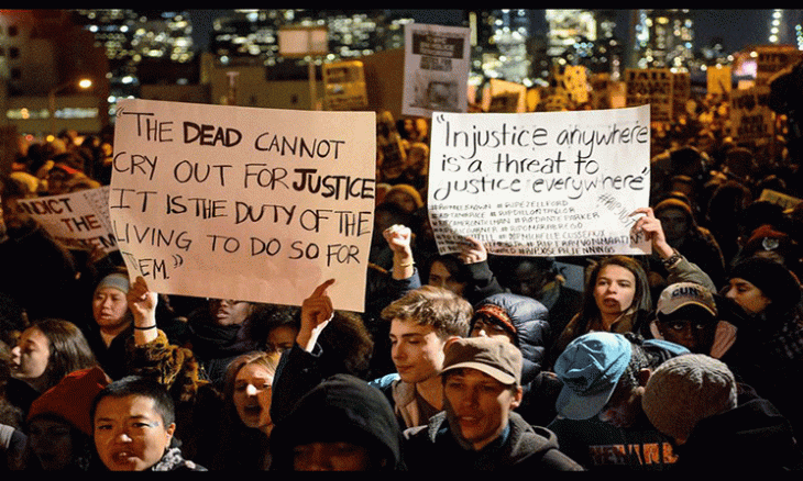 ورد المتظاهرون على عنف الشرطة بالخروج في الشوارع المترامية الأطراف في بروكلين، وكان يمكن سماع هتافات مثل” شرطة نيويورك.. ارفعوا ايديكم عن الأطفال السود”.