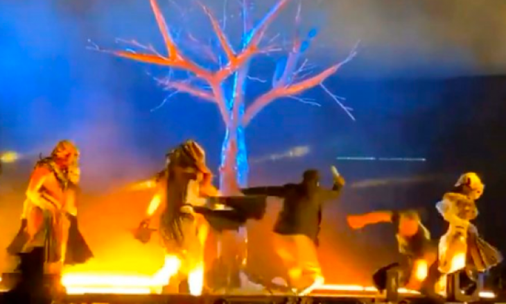 وظهر في التسجيل المصور رجل يرتدي زيا عاديا يعدو مسرعا على خشبة المسرح نحو مجموعة من أعضاء الفرقة المسرحية ثم يسقط على الأرض بينما يطارده شخص آخر.