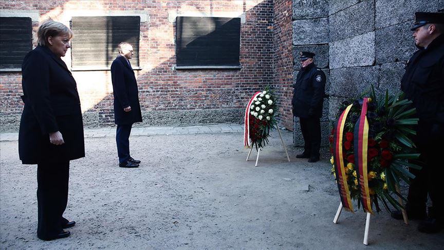 ووضعت ميركل مع رئيس الوزراء البولندي ماتيوس موراويكي، إكليلا من الزهور، تخليدًا لذكرى أكثر من مليون شخص قتلوا على يد النازيين، إبان الحرب العالمية الثانية.