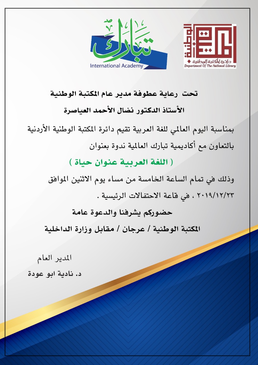 وهج 24 : بمناسبة اليوم العالمي للغة العربية وتحت رعاية مدير عام المكتبة الوطنية عطوفة الأستاذ الدكتور نضال الأحمد العياصرة تقيم دائرة المكتبة الوطنية الأردنية بالتعاون مع أكاديمية تبارك العالمية ندوة بعنوان ( اللغة العربية عنوان حياة ) وذلك في تمام الساعة الخامسة من مساء يوم الاثنين الموافق 23/12/2019 ، في قاعة الاحتفالات الرئيسية . المتحدثون في الندوة:- الأستاذ الدكتور سمير ستيتية/ مجمع اللغة العربية. الدكتورة نادية ابو عودة / مدير عام اكاديمية تبارك العالمية. الخبير الدولي الدكتور صلاح الفريجي/ اكاديمية تبارك العالمية. ويدير الندوة الاستاذ الدكتور عمر الفجاوي / استاذ الأدب الجاهلي في الجامعة الهاشمية.
