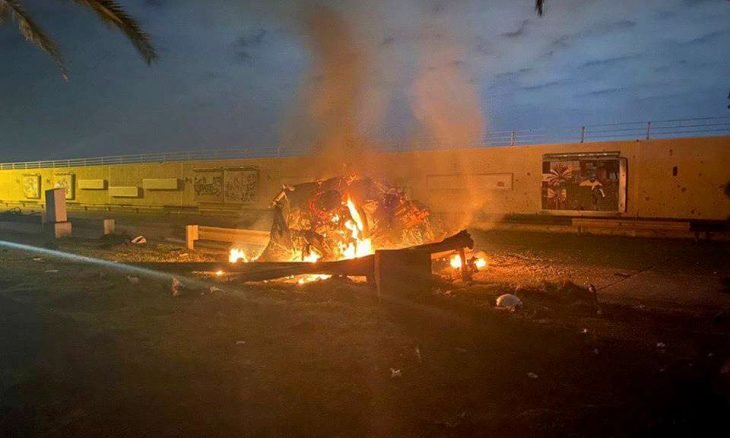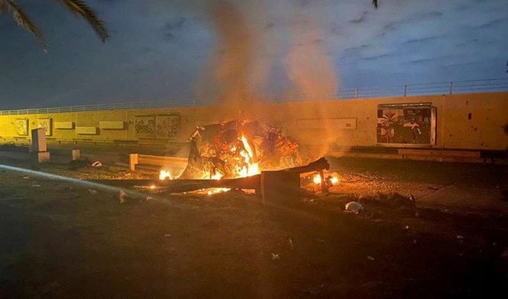 وقتل سليماني، وأبو مهدي المهندس نائب رئيس هيئة الحشد الشعبي و8 أشخاص كانوا برفقتهما في قصف صاروخي استهدف سيارتين كانا يستقلانهما على طريق مطار بغداد بعد منتصف ليل الخميس-الجمعة.