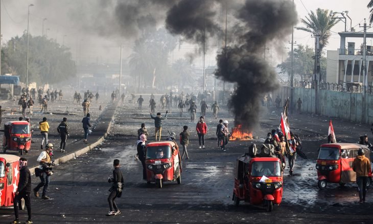 وذكر الشهود أن “الحياة شبه متوقفة وأن سحبا كثيفة من الدخان تغطي الشوارع على خلفية إحراق الإطارات، فيما رافق هذه الاضطرابات أعمال عنف ومصادمات بين القوات الأمنية والمتظاهرين استخدمت خلالها الغازات المسيلة للدموع وخاصة في بغداد والناصرية”.