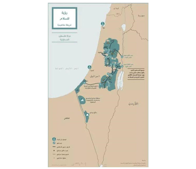 وكتب ترامب تغريدة باللغة العربية عبر حسابه الرسمي بموقع تويتر: “هذا ما قد تبدو عليه دولة فلسطين المستقبلية بعاصمة في أجزاء من القدس الشرقية”، مرفقاً صورة لخريطة تقسيم الأراضي بين (الفلسطينيين والإسرائيليين)، حسب خطته.