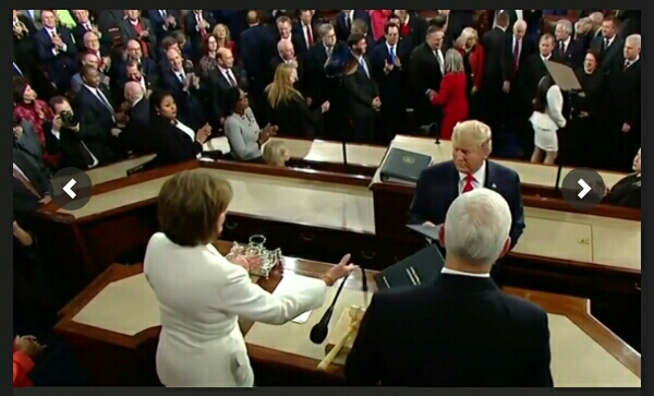 ترامب تجاهل يد بيلوسي الممدودة لمصافحته بعد أن سلمها نسخة من الخطاب، لترد الأخيرة بتمزيق الخطاب وألقته جانبا.