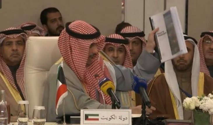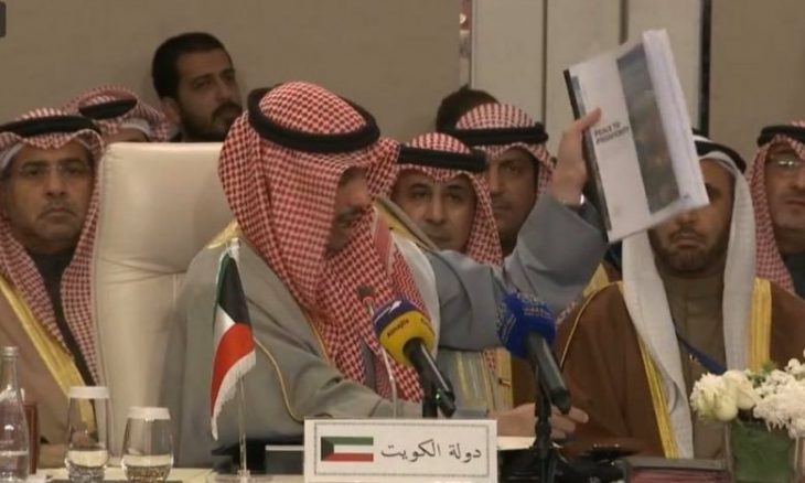 وألقى الغانم بأوراق الصفقة في سلة القمامة، قائلا: “باسم الشعوب العربية أقول هذه صفقة القرن ومكانها مزبلة التاريخ”.