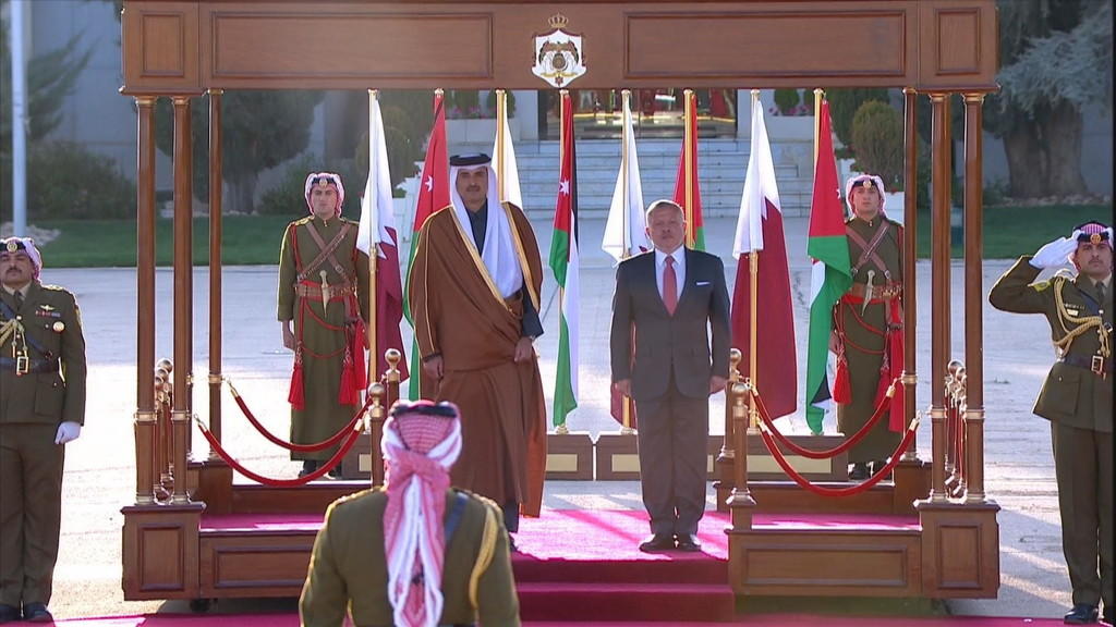 وجرت لضيف الأردن الكبير لدى وصوله مطار الملكة علياء الدولي، مراسم استقبال رسمية، حيث أطلقت المدفعية إحدى وعشرين طلقة تحيّة للضيف، فيما عزفت الموسيقى السلامين الوطني القطري والملكي الأردني.