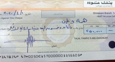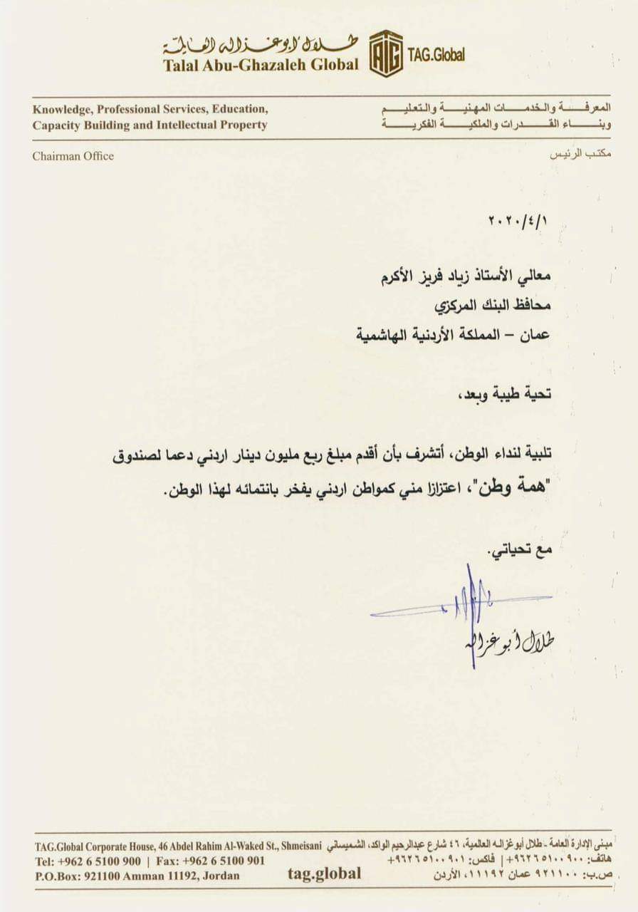 وقال أبو غزالة في رسالة وجهها لمحافظ البنك المركزي زياد فريز ‘تلبية لنداء الوطن أقدم مبلغ ربع مليون دينار، دعما لصندوق همة وطن’.