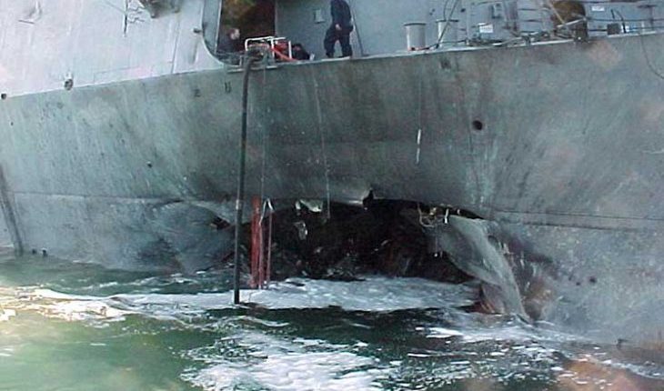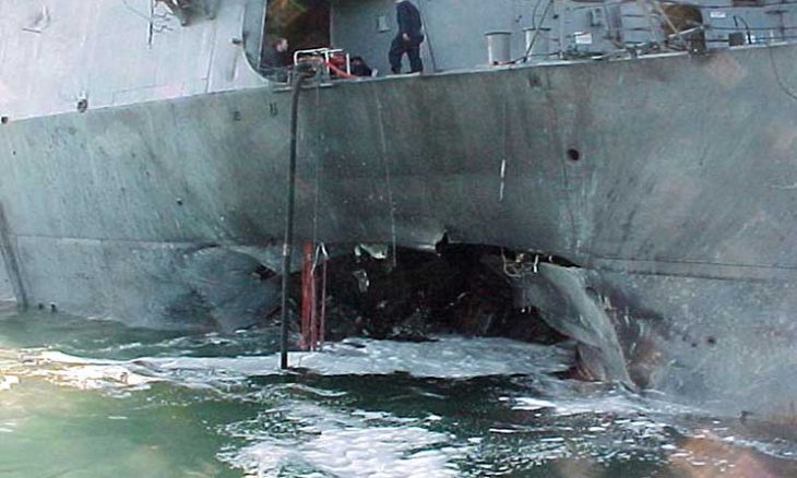 ووقعت الحادثة في 12 تشرين الأول/أكتوبر 2000 عندما انفجر زورق مفخخ بالمتفجرات في جسم المدمرة، ما اضطر إلى سحبها إلى ميناء عدن اليمني لإصلاح الدمار الذي أحدثه التفجير في جسمها. وقتل جراء التفجير 17 بحارا أمريكيا إضافة إلى اثنين من المهاجمين، يعتقد أنهما ينتميان إلى تنظيم القاعدة.