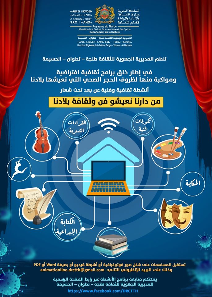 وهج 24 : تحت شعار “من دارنا نعيشو فن وثقافة بلادنا” وتفعيلا لتوجيهات وزارة الثقافة والشباب والرياضة – قطاع الثقافة – الرامي الى الحد من تداعيات وإجراءات الحجر الصحي على القطاع الثقافي في شقه المتعلق بالتنشيط الثقافي والفني عن بعد، فقد اشرفت المديرية الجهوية للثقافة بجهة طنجة تطوان الحسيمة على تنفيذ برنامج ثقافي وفني متنوع -عن بعد- شمل في مضمونه محاور عدة تهم المسرح، الموسيقى، التشكيل، الكتاب، ورشات علمية وترفيهية وفقرات قصصية وحكاية للأطفال…. البرنامج راعى في تنزيله مختلف الفئات العمرية والشرائح الاجتماعية وقد امتد على كل تراب الجهة في كل من المراكز الثقافية لتطوان، العرائش، شفشاون، المضيق، الفنيدق، مارتيل والحسيمة. كما عمل على اشراك عدد مهم من الفنانات والفنانين المنتمين لتراب الجهة والذي تجاوز عددهم الى حدود الساعة 149 فنان وفنانة، كما ان مصالح المديرية كانت قد اعلنت سابقا عبر صفحاتها في مواقع التواصل الاجتماعي عن إبداء الرغبة في المشاركة في فقرات وانشطة برنامجها الثقافي ” من دارنا نعيشو فن وثقافة بلادنا ” ما تجاوب معه عدد مهم من ممتهني الفنون عبر تراب الجهة حيث هناك ما يقارب 152 مادة فنية وثقافية قيد البرمجة في الأيام القادمة.