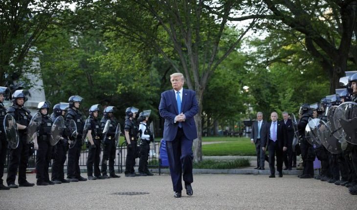 وهي تتكشف بشكل واضح على شاشات التلفزة في عنف بائس تقوم فيه السلطات الفدرالية بمهاجمة المتظاهرين السلميين أمام البيت الأبيض بالغاز المسيل للدموع والرصاص المطاطي، في وقت وقف فيه ترامب الخارج من روايات جورج أوريل في ساحة روز غاردن يعلن دعمه للتظاهر السلمي. وهدد دونالد ترامب بتعبئة القوات الأمريكية لضرب مواطني الولايات المتحدة وبدون إذن من السلطات الفدرالية، ثم مشى إلى كنيسة سانت جونز بعدما تم تفريق المتظاهرين بالغاز المسيل للدموع والقوة لكي يقف في وسطها ويلتقط صورة للإعلام.