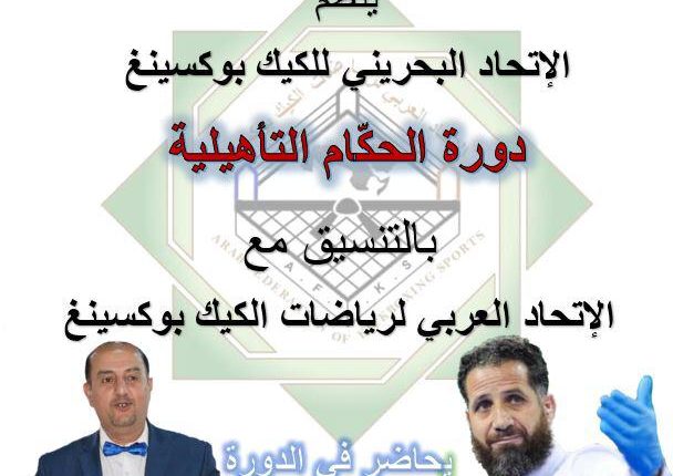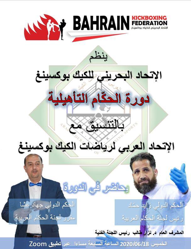 وهج 24 : تحت رعاية رئيس الاتحاد العربي لرياضات للكيك بوكسينغ الدكتور باسل الشاعر ينظم الاتحاد مع الاتحاد البحريني للكيك بوكسينغ دورة الحكام التأهيلية وذلك يوم الخميس عبر تطبيق زوم ، يحاضر في الدورة رئيس لجنة الحكام الاردنية والعربية الحكم الدولي المحاضر زايد حماد غيث ومقرر لجنة الحكام الاردنية والعربيه الحكم الدولي المحاضر جهاد عشا .