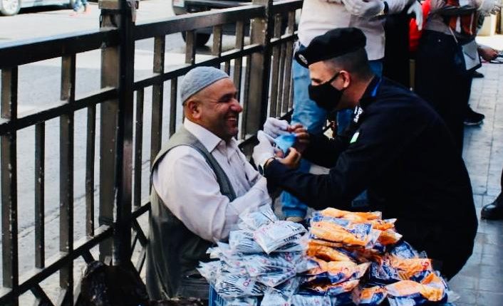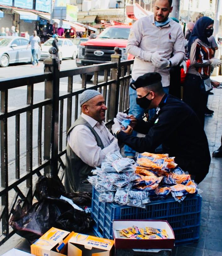ملازم احمد الحراحشه من مرتب الامن العام يساعد رجل مسن وضرير بإرتداء ادوات السلامة العامة في وسط البلد.