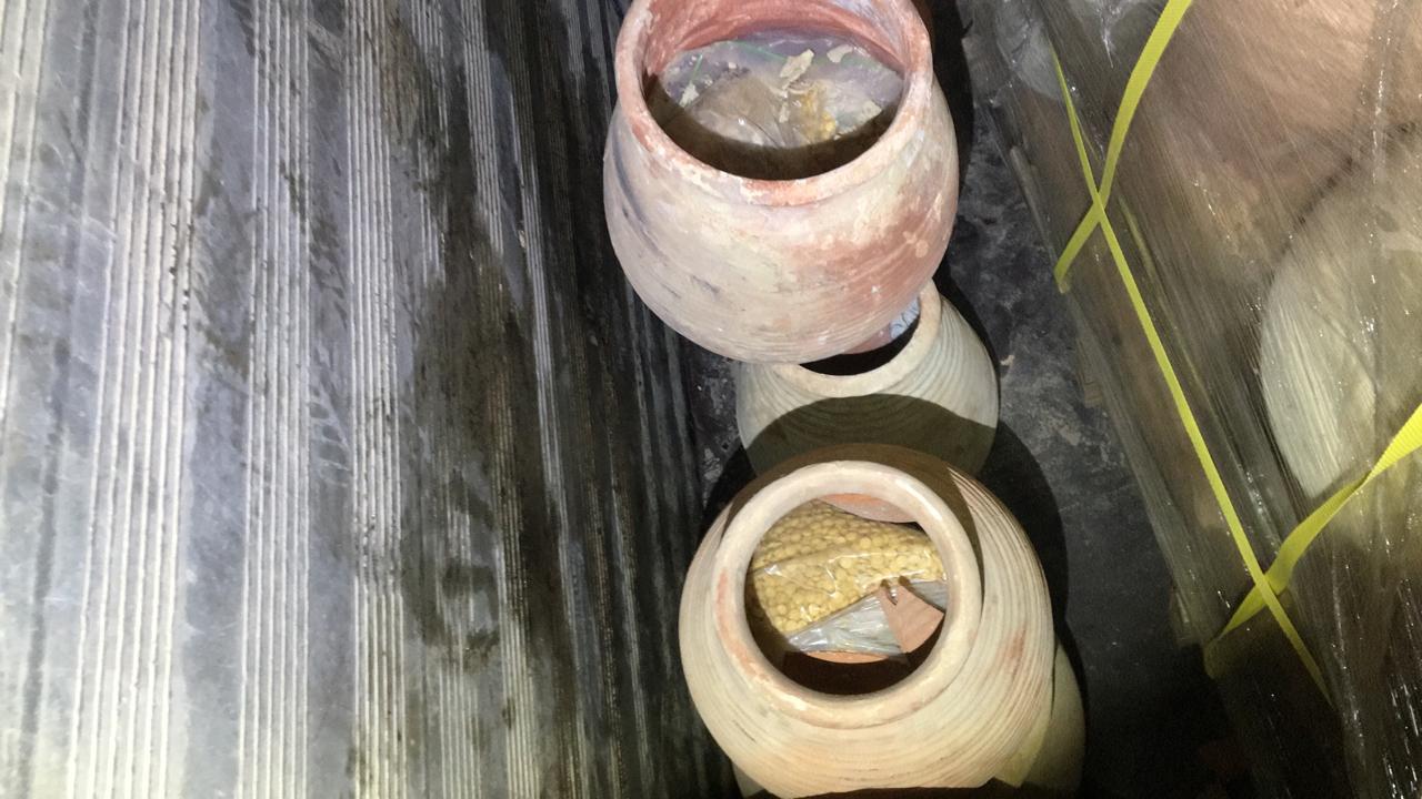 واضاف الناطق الاعلامي انه ومن خلال التحقيقات وجمع المعلومات تم تحديد مكان تخزين المواد المخدرة داخل احدى مركبات الشحن حيث تم التحرك للمكان وضبط مركبة الشحن وبتفتيشها عثر داخلها على كمية من الفخارات أُخفي بداخلها ما يزيد عن ٤٠٠ الف حبة مخدرة .