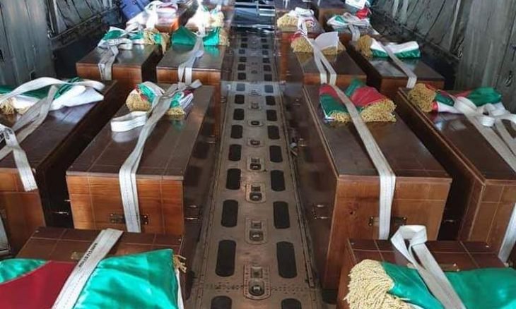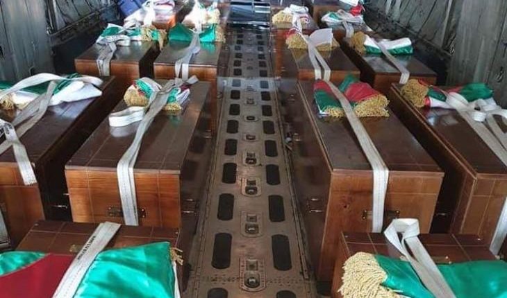 وكان في استقبال النعوش الرئيس الجزائري عبد المجيد تبون وحشد من حرس الشرف. وستنقل الرفات إلى قصر الثقافة.