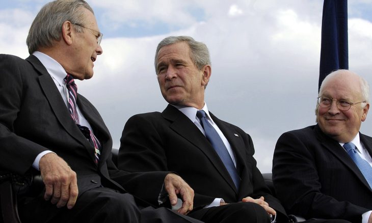 وعلى مدار العام التالي، دفع تشيني وغيره من الإيدلوجيين نظريتهم الزائفة إلى الأمام، مع مزاعم كاذبة كئيبة بشكل متزايد بأن صدام أنتج وخزن ترسانة من الأسلحة النووية والبيولوجية والكيمائية سراً.