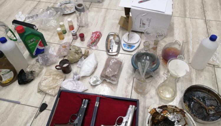 وتابع الناطق الاعلامي ان فرق التحقيق وبإسناد من الفريق الخاص داهمت المكان وضبطت شخصين من المتورطين داخله، وبتفتيش الشقة عثر داخلها على مادة على شكل بودرة مختلفة الالوان ومواد حجرية ومواد سائلة كيميائية وجميعها تدخل كمواد خام في تصنيع المواد المخدرة وخاصة مادة الحشيش الصناعي والكريستال والكوكائين المخدرة اضافة الى مجموعة من المعادلات الكيميائية لغايات تركيب المواد المخدرة وسلاحين ناريين .