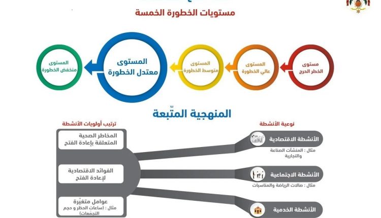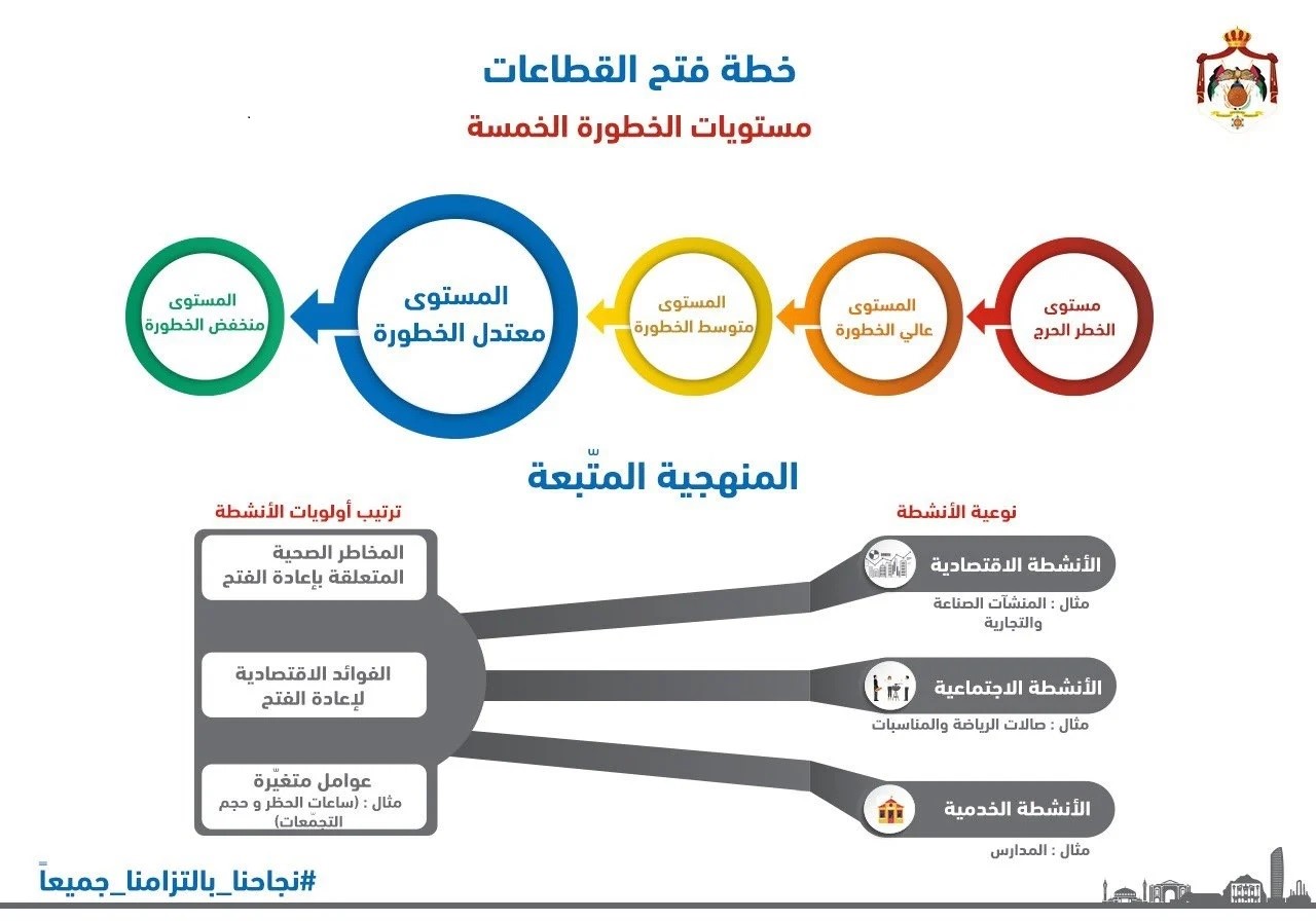 وبحسب المصفوفة يتطلب الانتقال من مربع إلى مربع تسجيل 10 إصابات فأكثر بكورونا بشكل يومي وعلى مدار 10 أيام متتالية، إذ إن الأردن الآن في “المربع الأزرق” وهو مستوى معتدل الخطورة، إلا أنه من الممكن العودة إلى المربع الأصفر (متوسط الخطورة).