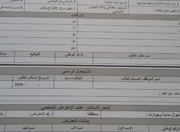 كما يحق لكل شخص ورد اسمه في الجدول الأولي للناخبين الاعتراض على تسجيل غيره في دائرته الانتخابية خلال مدة سبعة أيام من اليوم التالي لتاريخ عرض الجداول، وتقدم الاعتراضات في هذه الحالة لدى لجنة الانتخاب في مقر عمل اللجنة، أو أي من المكاتب الفرعية التابعة للجنة.