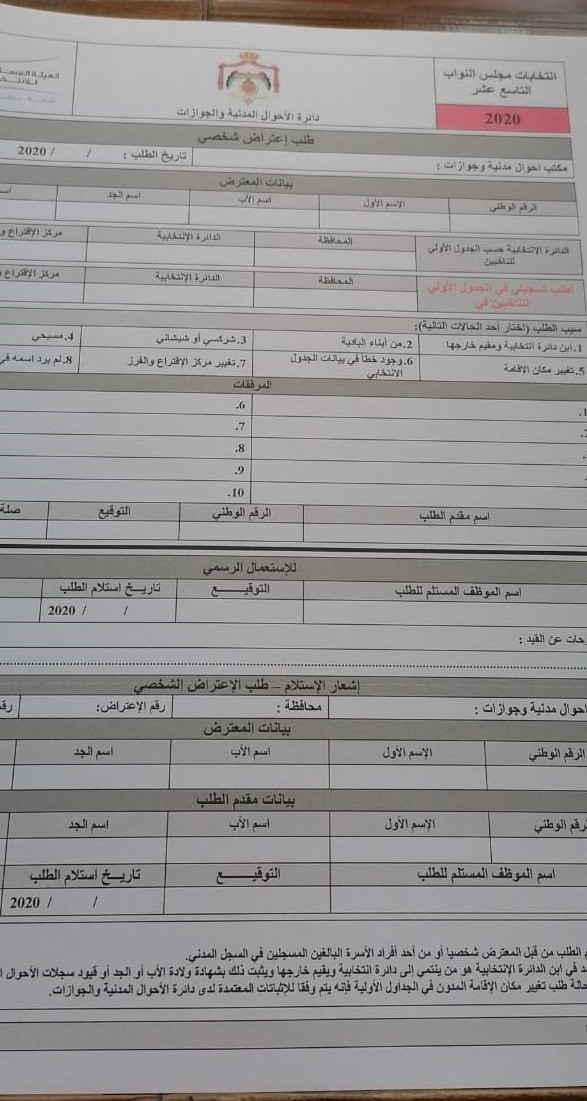 ووفق قانون الانتخاب فأنه يحق لكل شخص أن يتقدم بطلب خطي خلال أربعة عشر يوما من اليوم التالي لتاريخ عرض الجداول الأولية للناخبين إلى دائرة الاحوال المدنية والجوازات لإدراج اسمه أو تصحيح خطأ أو مراعاة تغيير مكان الإقامة؛ وتسجيل اسمه في الجداول الأولية الخاصة بالدائرة الانتخابية إذا كان من أبناء الدائرة المقيمين خارجها وتسجيل اسمه في الجدول الأولي الخاص بأي دائرة انتخابية مخصص لها مقعد شركسي أو شيشاني أو مسيحي ضمن المحافظة ذاتها أو في أي محافظة أخرى في حال عدم وجود مقعد له في المحافظة التي يقيم فيها.