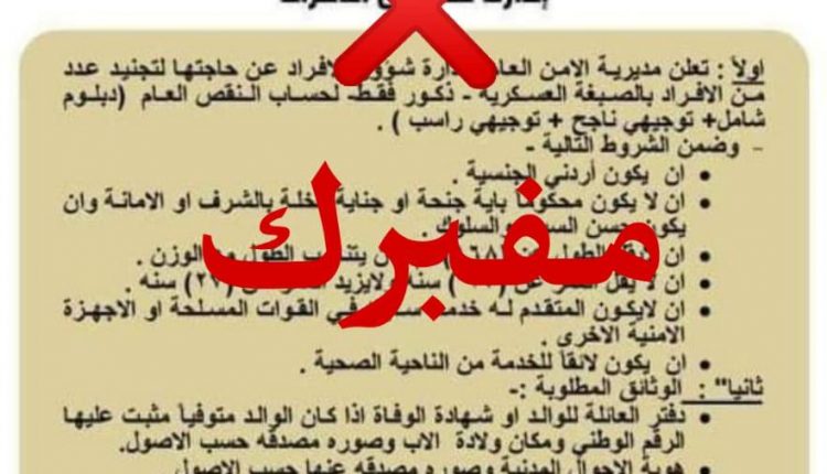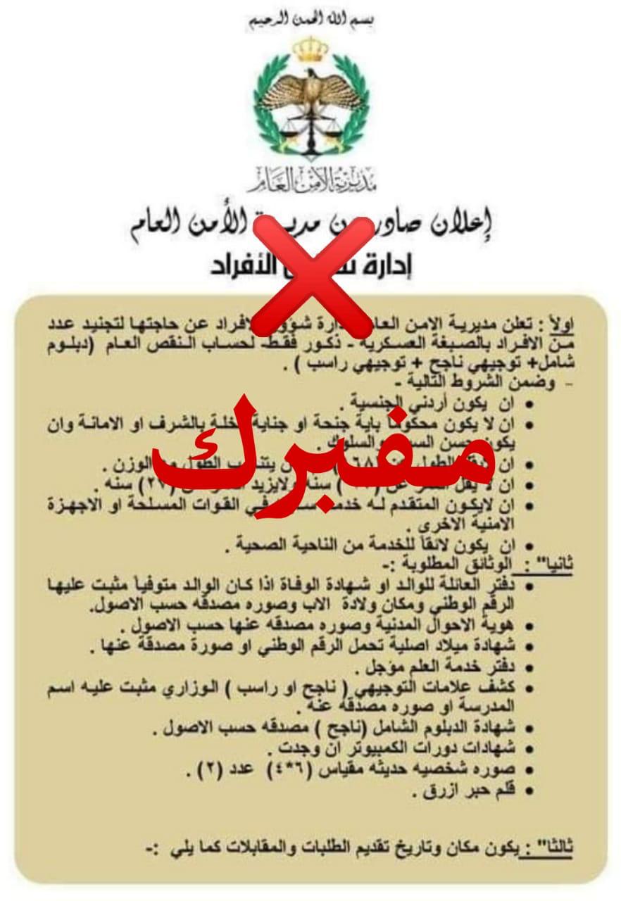 الامن العام : إعلان التجنيد الذي يجري تداوله عبر مواقع التواصل الاجتماعي مفبركٌ وغير صحيح