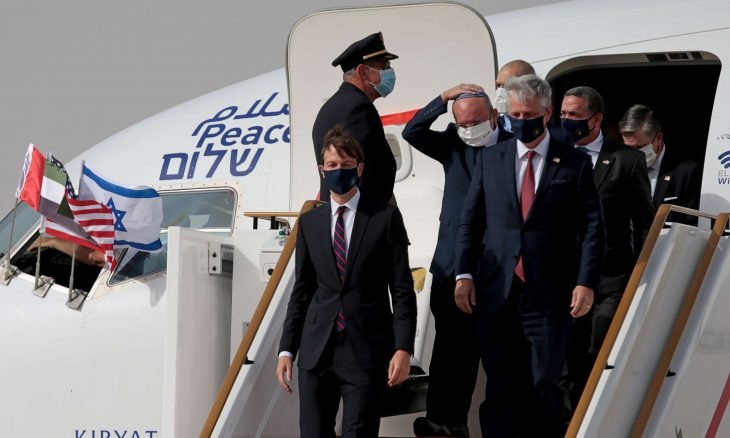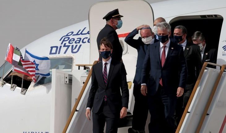 وحطّت الإثنين، في أبوظبي، أول رحلة تجارية بين إسرائيل والإمارات، كانت انطلقت من مطار بن غوريون بالقرب من تل أبيب وعلى متنها وفد إسرائيلي أمريكي يترأسه صهر الرئيس الأمريكي ومستشاره جاريد كوشنر، بعد نحو أسبوعين من الإعلان عن اتفاق تطبيع العلاقات بين أبوظبي وتل أبيب.