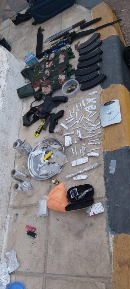 كما والقي القبض كذلك شرق العاصمة على شخص مطلوب ومصنف بالخطير جدا والمسلح بعد ان ابدى مقاومة شديدة وحاول الفرار وضبط بحوزته كمية من المواد المخدرة المعدة للبيع ، وفي شمال العاصمة جرت مداهمة منزل شخص مصنف بالخطير جدا بعد التاكد من وجوده داخله والقي القبض عليه وضبط بحوزته سلاح ناري وكيلو ونصف من مادة بودرة الحشيش الصناعي وكمية من مادتي الكريستال والحشيش المخدرتين .