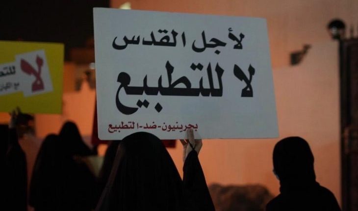 وردد المشاركون، هتافات رافضة للتطبيع، ومنددة بالاتفاق الذي وقعته بلادهم مع إسرائيل، أبرزها: “التطبيع خيانة”، “بقاؤكم مستحيل.. الرحيل الرحيل” في إشارة إلى النظام البحريني.