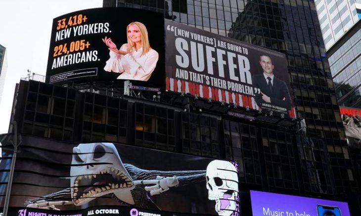 وتظهر أحدى الوحات الإعلانية في نيويورك ابنة الرئيس وهي تبتسم مع تعليق يشير إلى عدد الأمريكيين وسكان نيويورك، الذين لاقوا حتفهم بسبب فيروس كورونا.