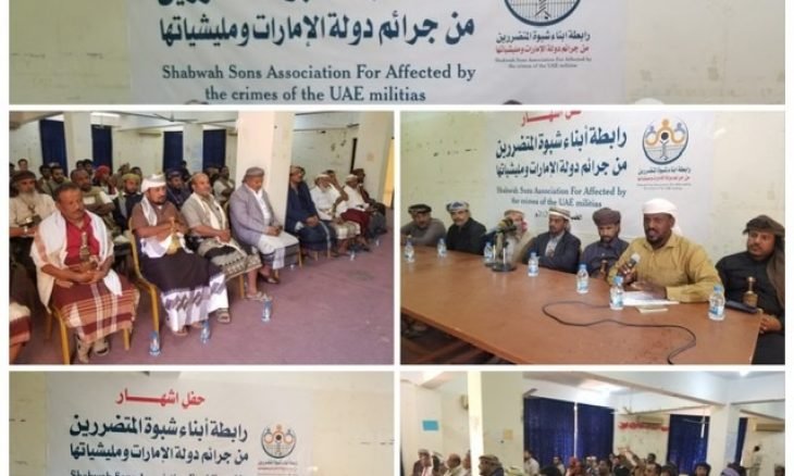 وهج 24 : أعلنت عائلات وأسر ضحايا جرائم الإمارات وميلشياتها في محافظة شبوة عن تأسيس رابطة ” رابطة ابناء شبوة المتضررين من جرائم الإمارات وميليشياتها” للمطالبة بمعاقبة المجرمين وإنصاف اسر الضحايا الذين تعرضوا للانتهاكات من دولة الامارات او مليشياتها.