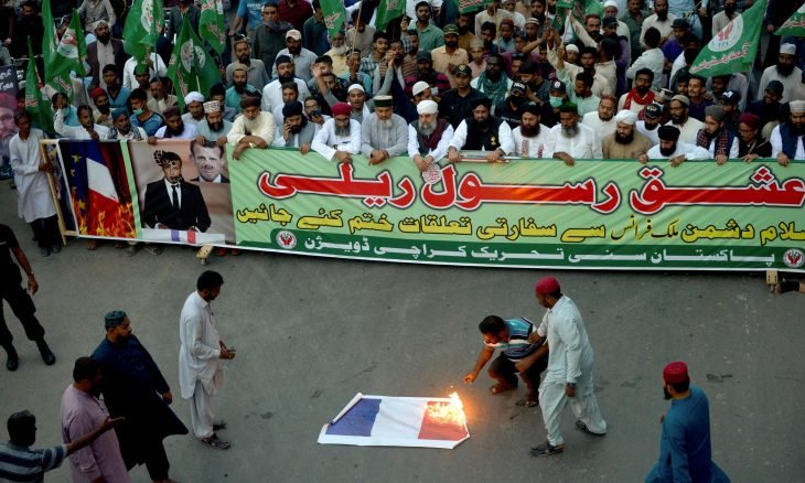 وسار النشطاء من حزب حركة “لبيك باكستان” اليميني المتطرف وسكان مدينة كراتشي الساحلية في الشوارع لدفع الحكومة الباكستانية على قطع الصلات مع فرنسا ومقاطعة المنتجات الفرنسية.
