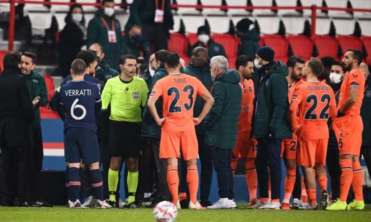 وذكرت تقارير صحفية فرنسية أن لاعبي باشاك شهير رفضوا استكمال المباراة، عقب عبارات عنصرية وجهها الحكم الرابع سباستيان كولتيسكو، لمساعد مدرب الفريق التركي بيير ويبو.