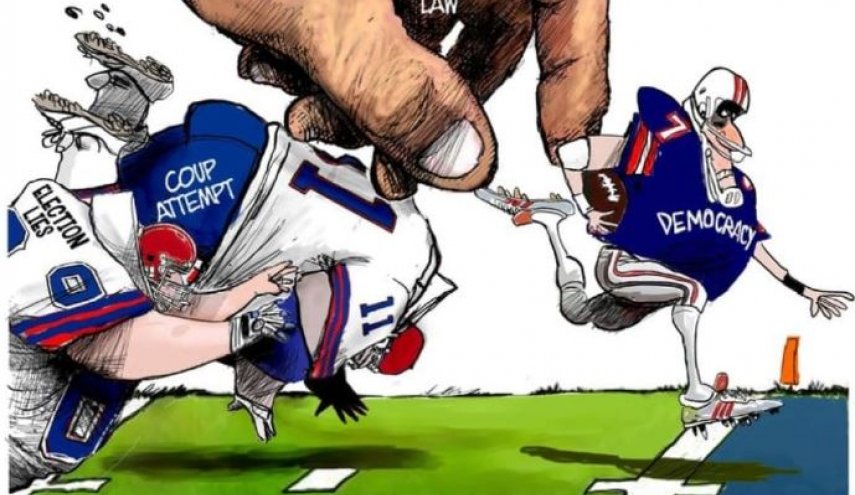 في هذا الرسم القوانين العرفية تحاول عرقلة العملية الانتخابية التي اوصلت بايدن للرئاسة ووضع ترامب مكانه من خلال محاولة الانقلاب.