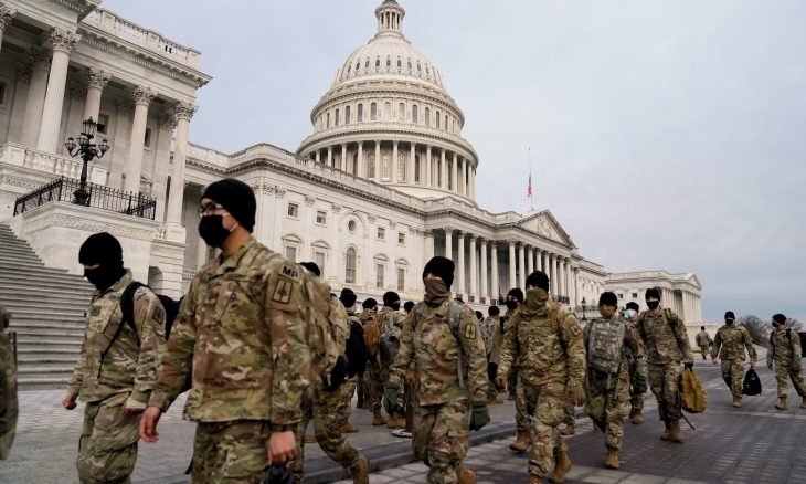 وفي مواجهة تهديدات بالعنف من أنصار الرئيس المنتهية ولايته دونالد ترامب، جرى تكليف الحرس الوطني بإرسال قوات قوامها 15 ألفا إلى واشنطن ومُنع السائحون من زيارة نُصُب واشنطن.