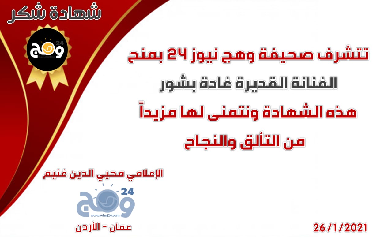 وهج نيوز _ تقرير دعاء وعل : قامت صحيفة وهج نيوز 24 بمنح شهادة شكر للفنانة القديرة غادة بشور، تقديراً لجهودها المبذولة في عالم الفن