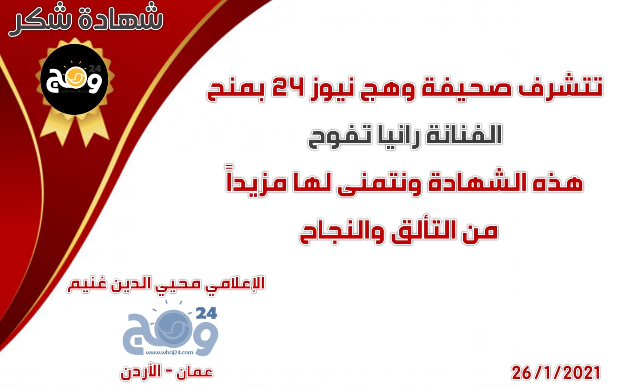وهج نيوز – تقرير دعاء وعل : قامت صحيفة وهج نيوز 24 بمنح شهادة شكر للفنانة رانيا تفوح، تقديراً لجهودها المبذولة في عالم الفن .