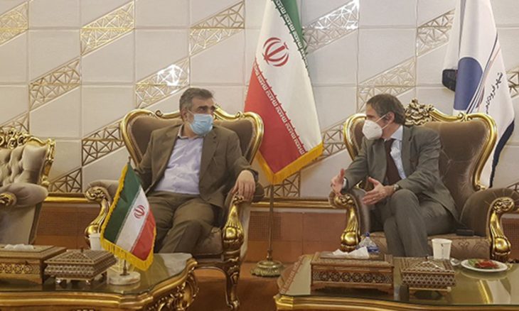 ونشر السفير كاظم غريب أبادي صورة عبر حسابه على تويتر قرابة الساعة التاسعة مساء (18:30 ت غ)، يظهر فيها غروسي متوسطا إياه ونائب رئيس المنظمة الإيرانية للطاقة الذرية بهروز كمالوندي، مع تعليق جاء فيه “المدير العام غروسي وصل الآن الى طهران”.