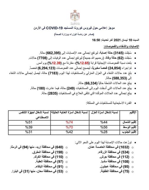 62 وفاة و3145 إصابة كورونا جديدة في الأردن On أبريل 10, 2021 Share وهج نيوز : أعلنت وزارة الصحة اليوم السبت عن تسجيل 62 حالة وفاة و3145 إصابة كورونا جديدة في الأردن. Share FacebookTwitterGoogle+ReddItWhatsAppPinterestالبريد الإلكتروني