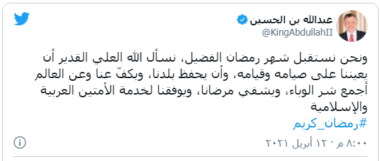 “ونحن نستقبل شهر رمضان الفضيل، نسأل الله العلي القدير أن يعيننا على صيامه وقيامه، وأن يحفظ بلدنا، ويكفّ عنا وعن العالم أجمع شر الوباء، ويشفي مرضانا، ويوفقنا لخدمة الأمتين العربية والإسلامية.”