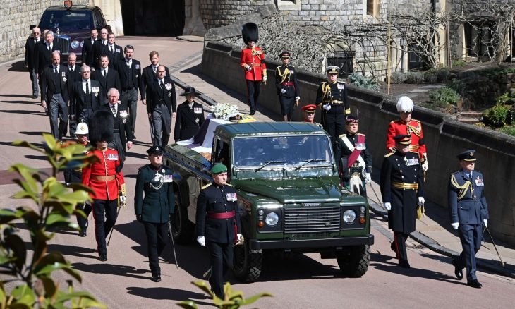 وتمت تغطية نعش فيليب برايته الملكية الشخصية ويم نقله في سيارة عسكرية خضراء من طراز “لاند روفر ديفندر”.