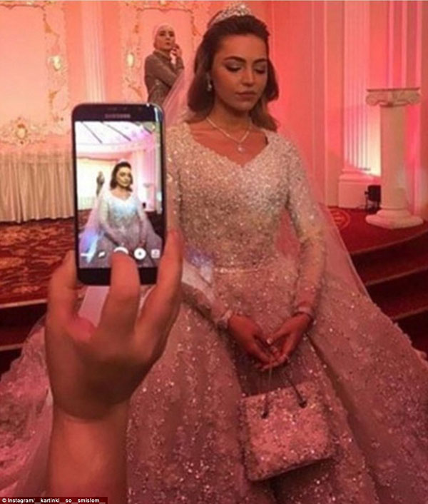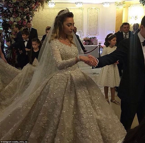 وأطلت العروس خديجة بفستان زفاف ملكي ساحر مرصع باللؤلؤ وأحجار الكريستال من بوتيك إيلي صعب كوتور في باريس والذي بلغت تكلفته 25 مليون روبل روسي، بينما كلف تاجها المصنوع من الذهب الأبيض والمرصع بالألماس 3 مليون روبل روسي.