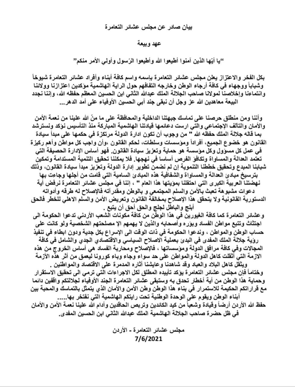 بيان صادر عن مجلس عشائر التعامرة .. عهد وبيعة On يونيو 7, 2021 Share وهج نيوز : بيان صادر عن مجلس عشائر التعامرة .. عهد وبيعة Share FacebookTwitterGoogle+ReddItWhatsAppPinterestالبريد الإلكتروني